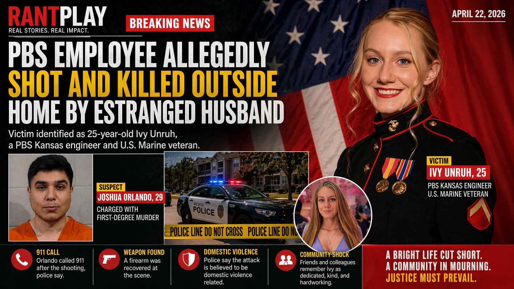 The victim, 25-year-old Ivy Unruh, worked as a broadcast engineer for PBS Kansas and was also a U.S. Marine veteran. She was reportedly shot outside her apartment in Wichita during the morning hours and was rushed to the hospital in critical condition.